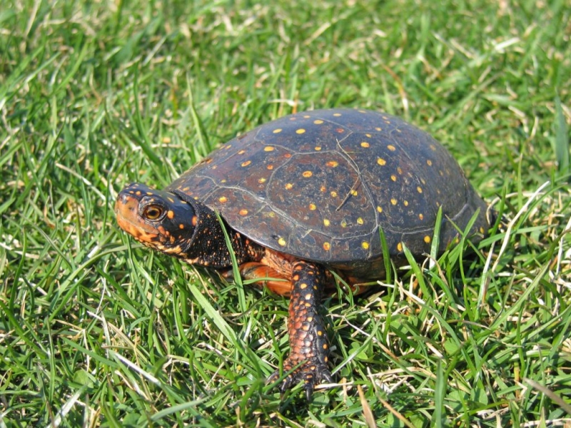 The Spotted Turtle is instantly recognizable by its small size, smooth black shell with conspicuous bright yellow spots spattered about the shell like polka dots.